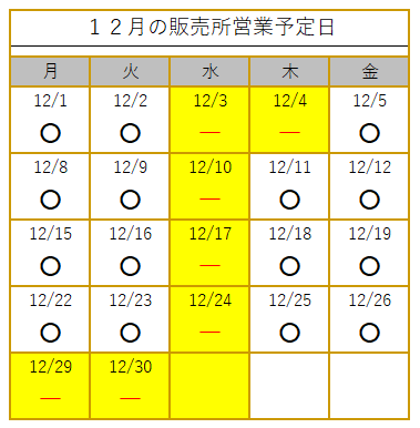 12月は… 大根 ○ その他のおすすめ商品 ○ 野菜 … 白菜、ほうれん草 野菜苗 … ありません 草花 … ポインセチア、葉ボタン ○ 加工品 ○ いちごジャム、ブルーベリージャム … 販売中 600円 マーマレード … 品切れ中 味噌 … 販売中 【その他】 ※ 実習状況及び収穫状況等により、日によって販売されている商品が異なります。 また営業日となっている日も、急遽お休みさせていただく場合がございます。 当日の状況については販売所までお問い合わせください。 ※ 新型コロナウイルス感染防止のために、マスクの着用、手指の消毒等にご協力ください。 ※ レジ袋の削減にご協力お願いします。マイバック・マイカゴ等を持参していただけると嬉しいです。 【販売所】 実習農場(旧上野農業高校) ・・・・・本校舎ではありませんのでご注意ください。 住所: 伊賀市荒木1856-55 TEL: 0595-24-0123 ,8248fd8d-5a3f-4263-92de-215444189e39,, |